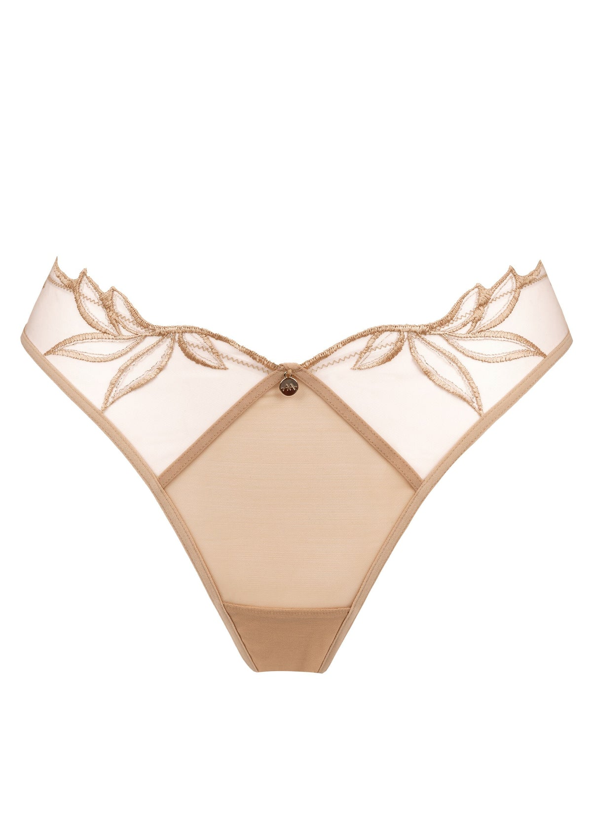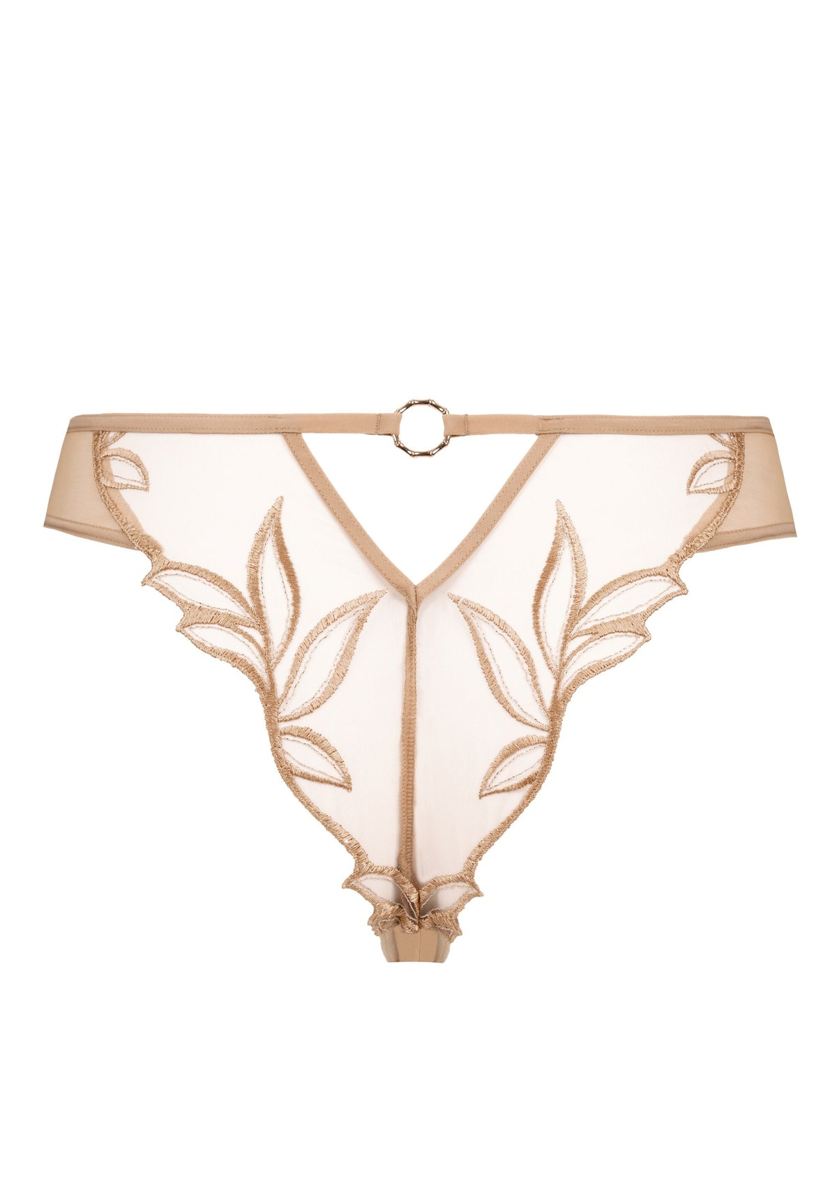 Ce tanga en tulle transparent sublime les courbes avec une broderie végétale au tracé graphique, délicatement posée sur les hanches et le bas du dos.