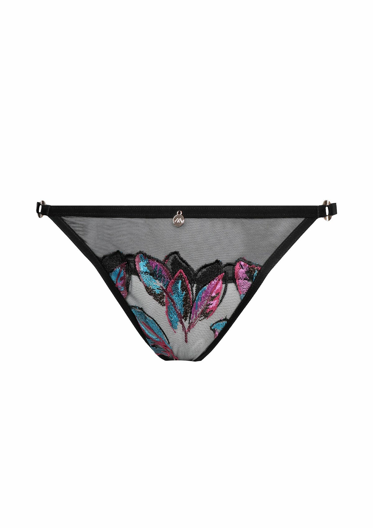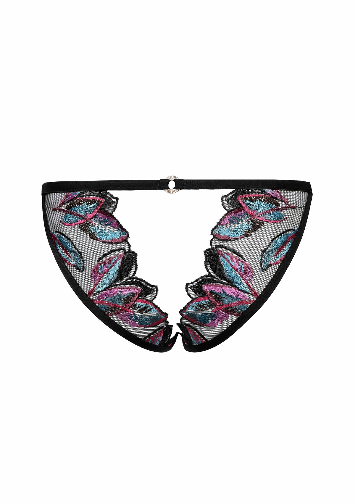 Devant en broderie et tulle, côtés élastiques ajustables soulignés de bijoux dorés, dos avec broderie totalement ouvert...