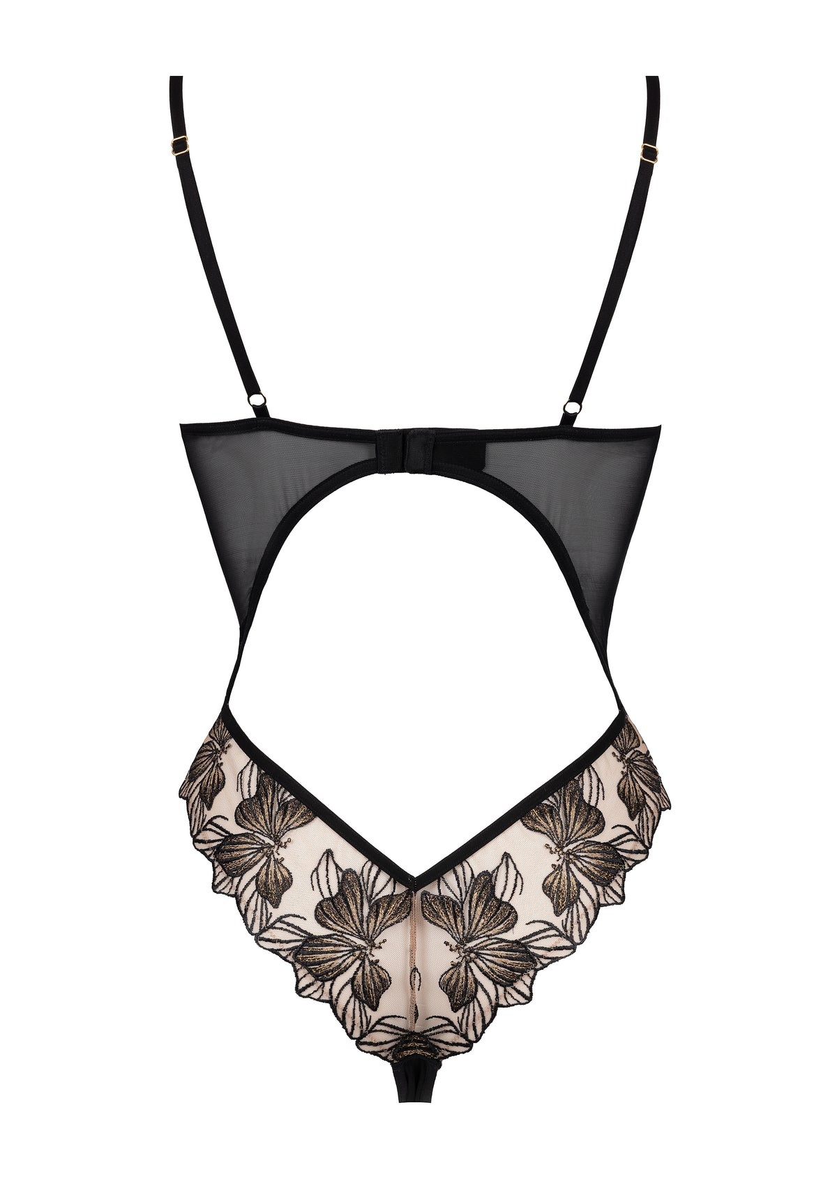This refined bodysuit combines the transparency of black tulle with the richness of black and gold floral embroidery on a nude background, inspired by Art Deco motifs.