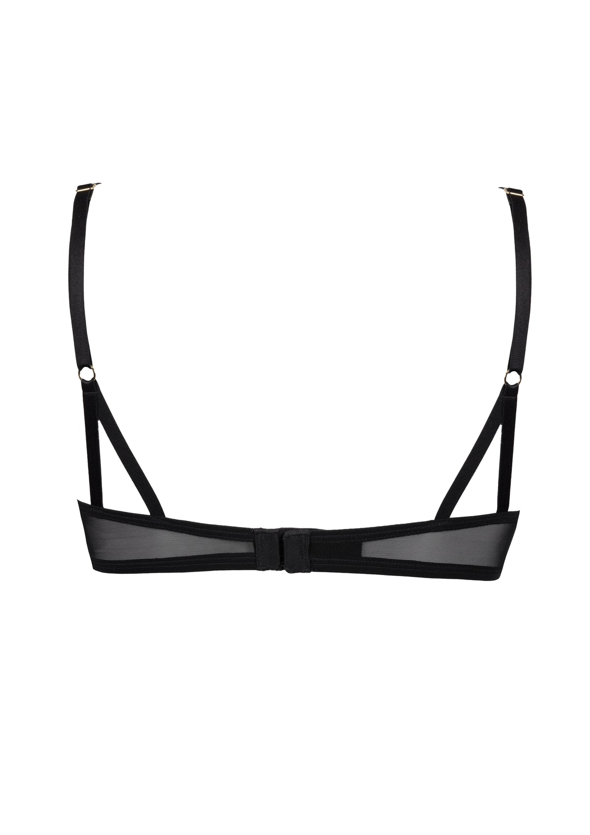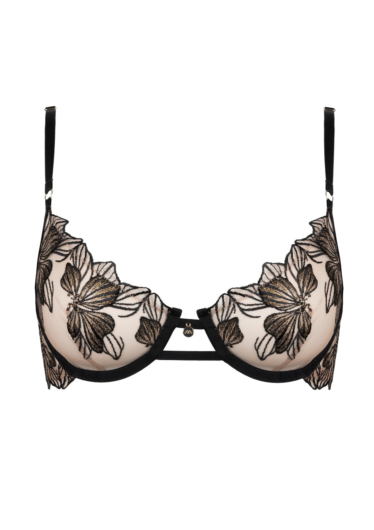 Underwired half cup bra, cups in black and gold floral embroidery on a flesh-colored background, with Art Deco-inspired motifs. The embroidered sides elegantly extend the design, while the transparent tulle back ensures lightness and comfort. The gold details and the Atelier Amour logo jewel on the separator complete this sensual and sophisticated piece.