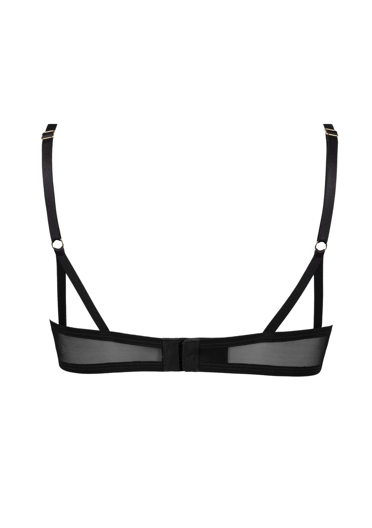 Triangle underwire bra in black and gold floral embroidery on a nude background, evoking the graphic elegance of Art Deco. The plunging neckline offers a sensual look, while the fine tulle back ensures comfort and lightness.