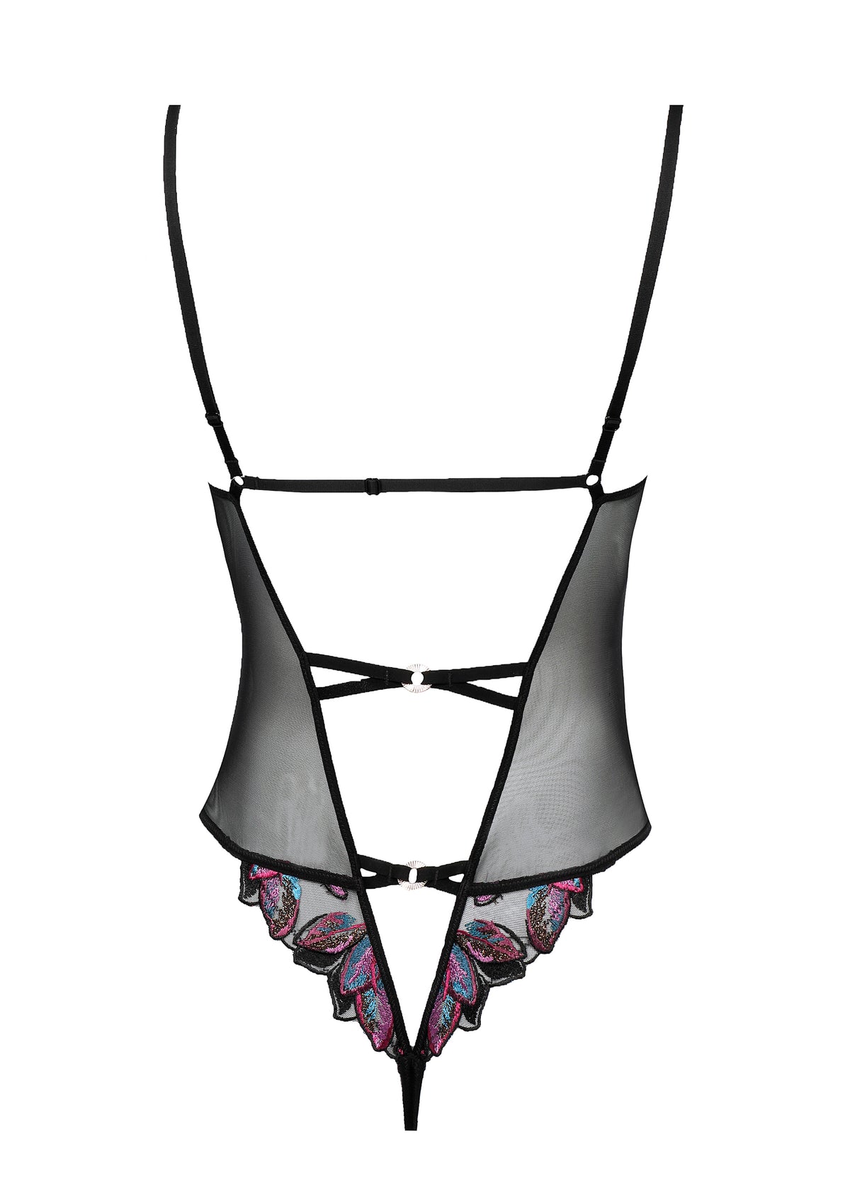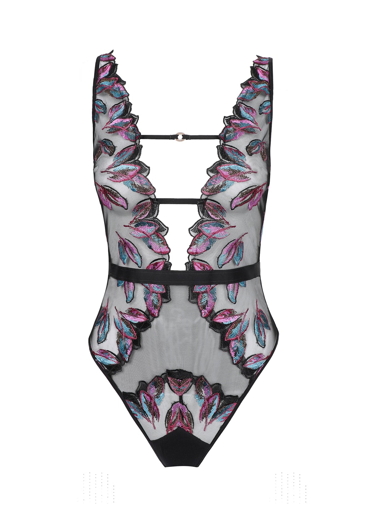 Sensual "V" neckline body in multicolored embroidery. Elasticated waist belt. String back with very deep tulle neckline with ties.