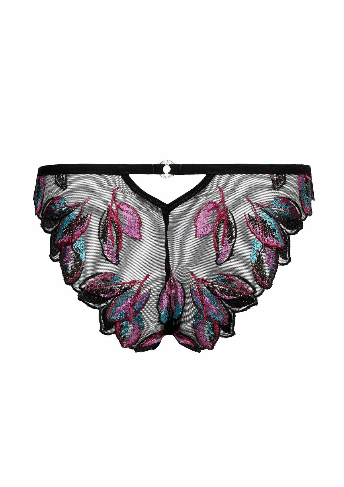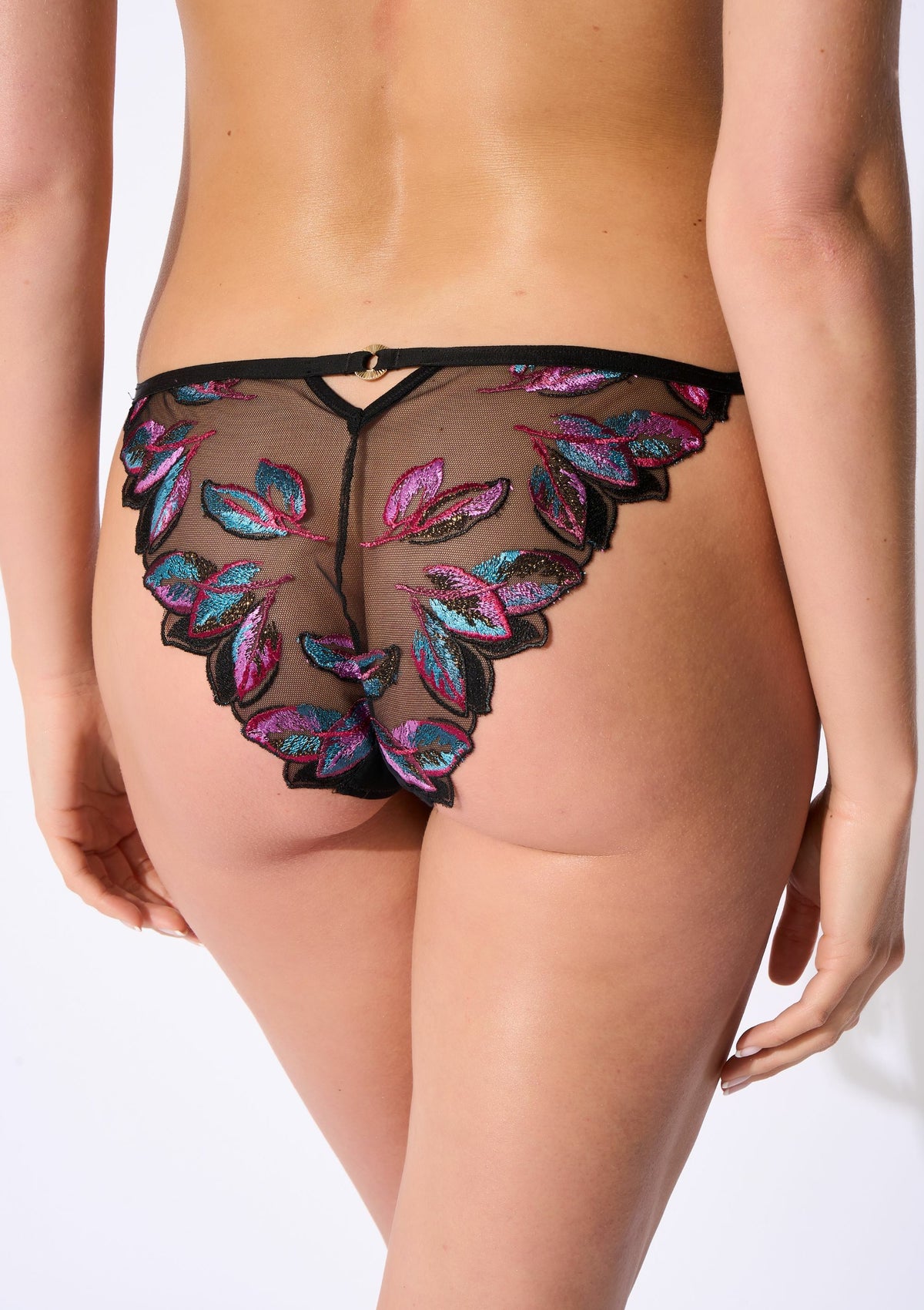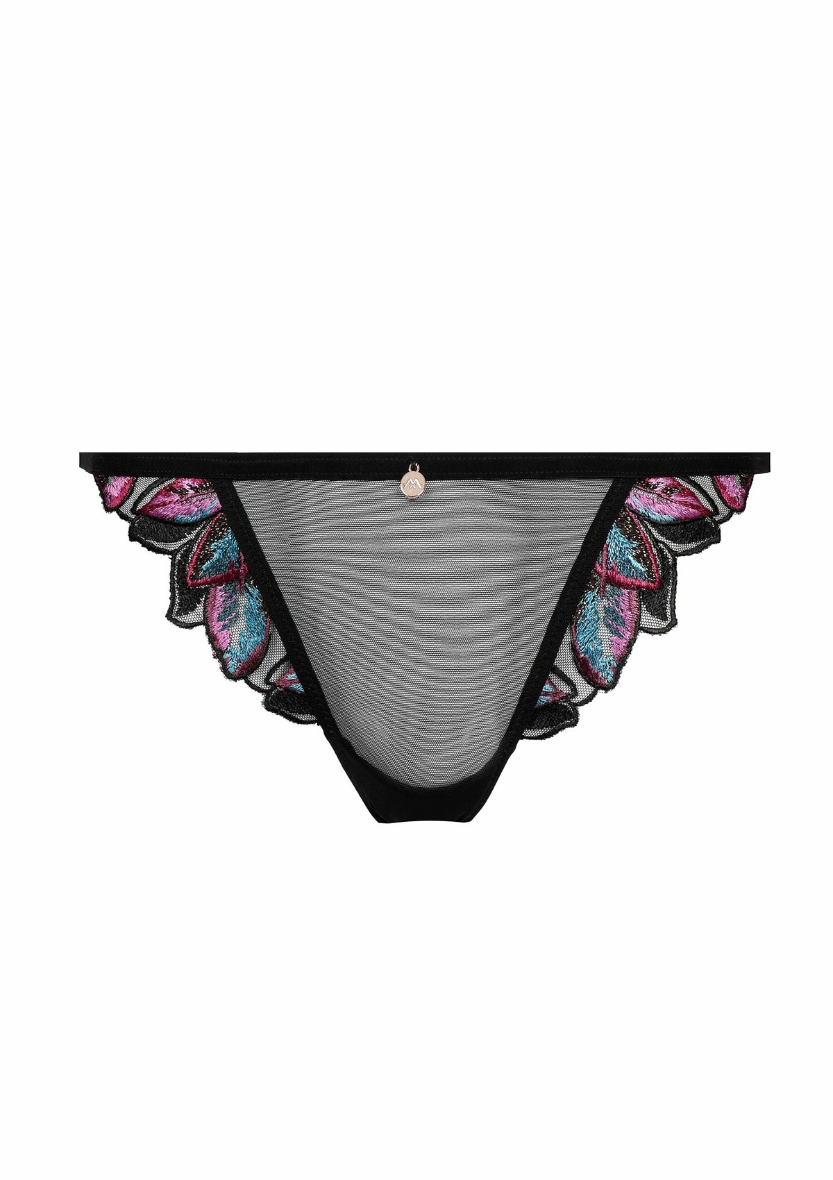 Devant en tulle et broderie, côtés élastiques réglables avec bijoux.