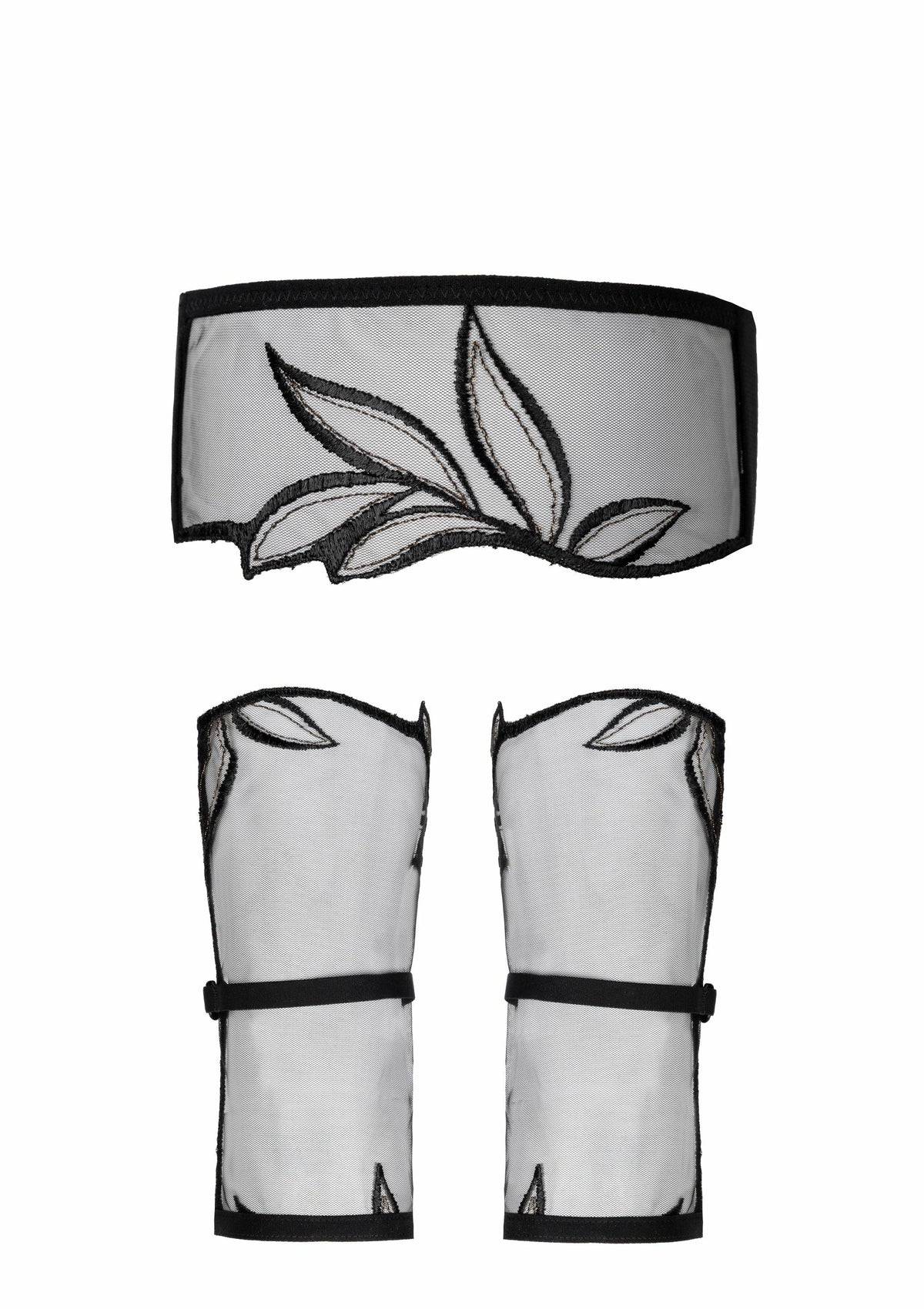 Composé d’un masque en tulle transparent brodé de motifs végétaux et de mitaines assorties, ce duo incarne l’art de la suggestion avec raffinement.