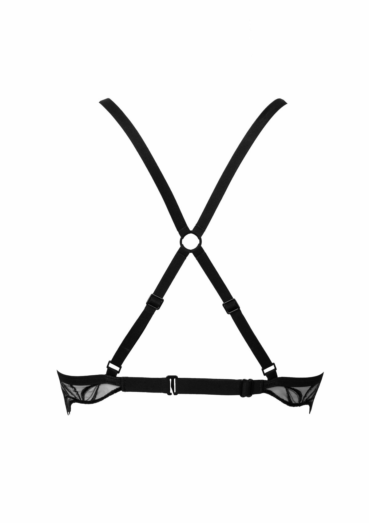 This open bra focuses on clean lines and a play of satin bands that boldly frame the bust.