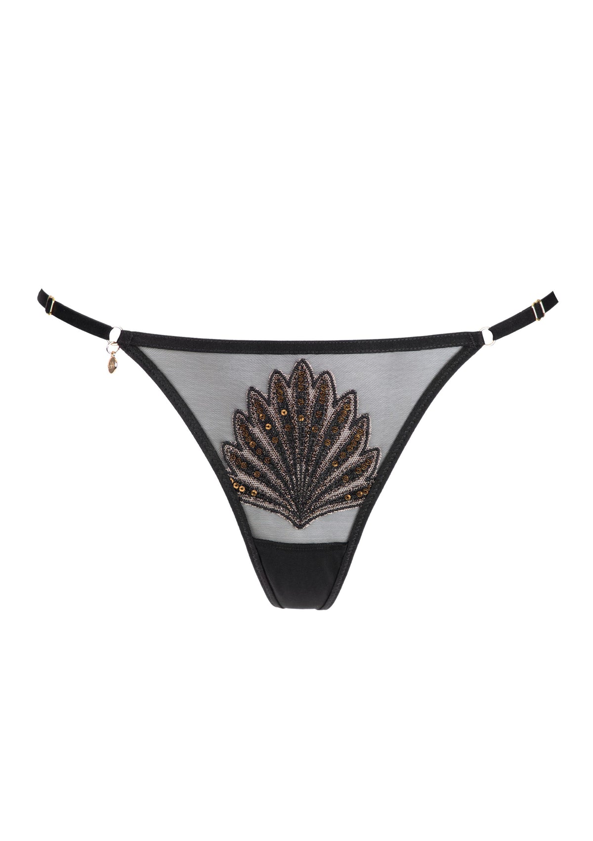 Soft and transparent tulle string enhanced with fan patterns of golden sequins at the front and back.