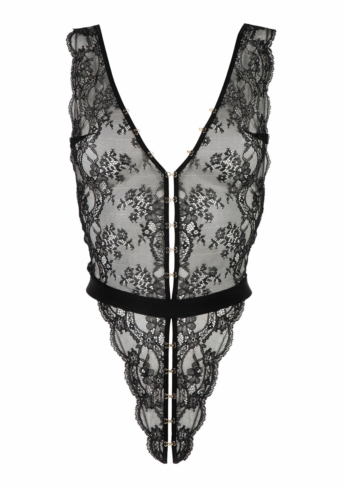 Lace bodysuit with a plunging neckline that opens from top to bottom thanks to the small golden hooks.