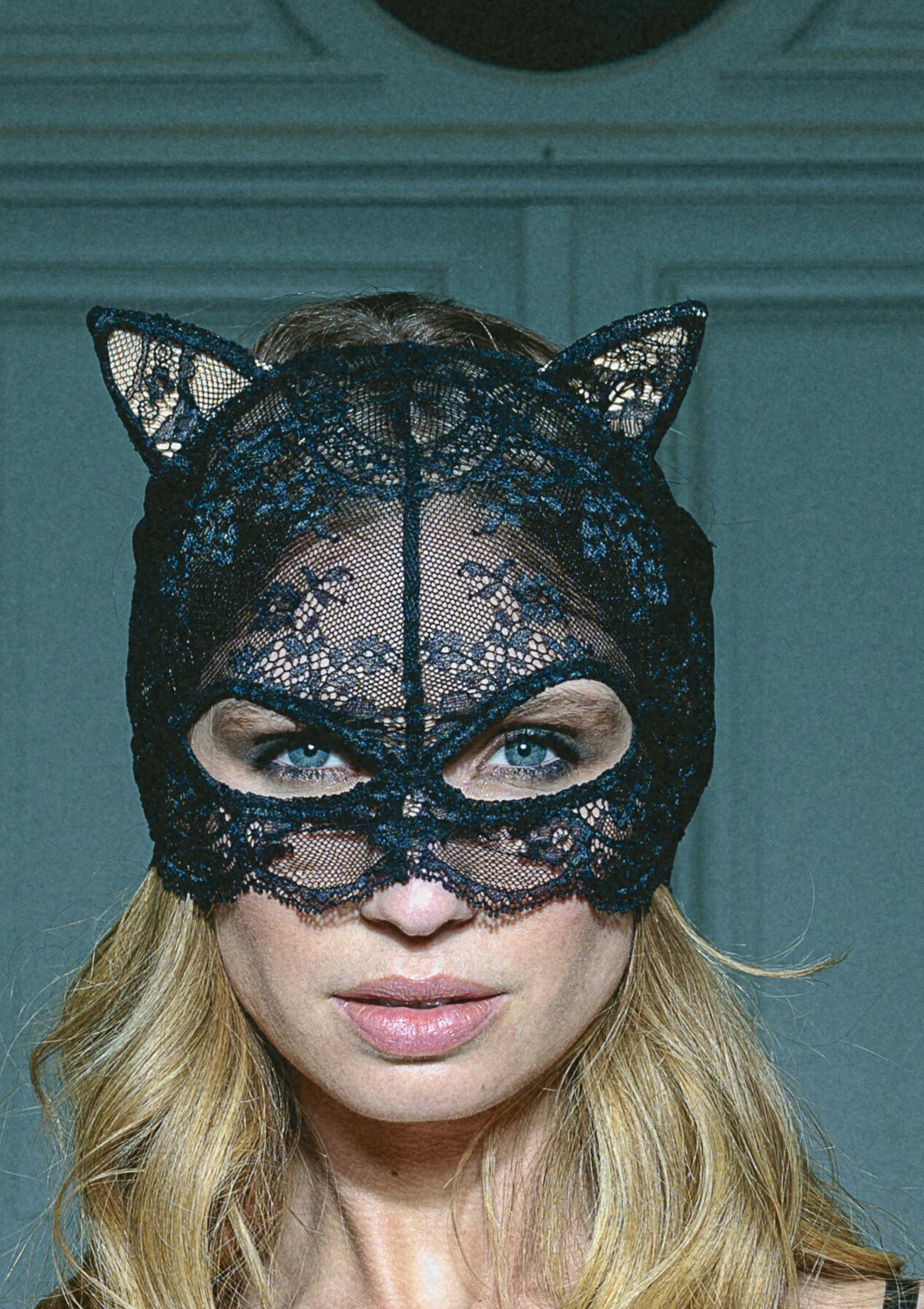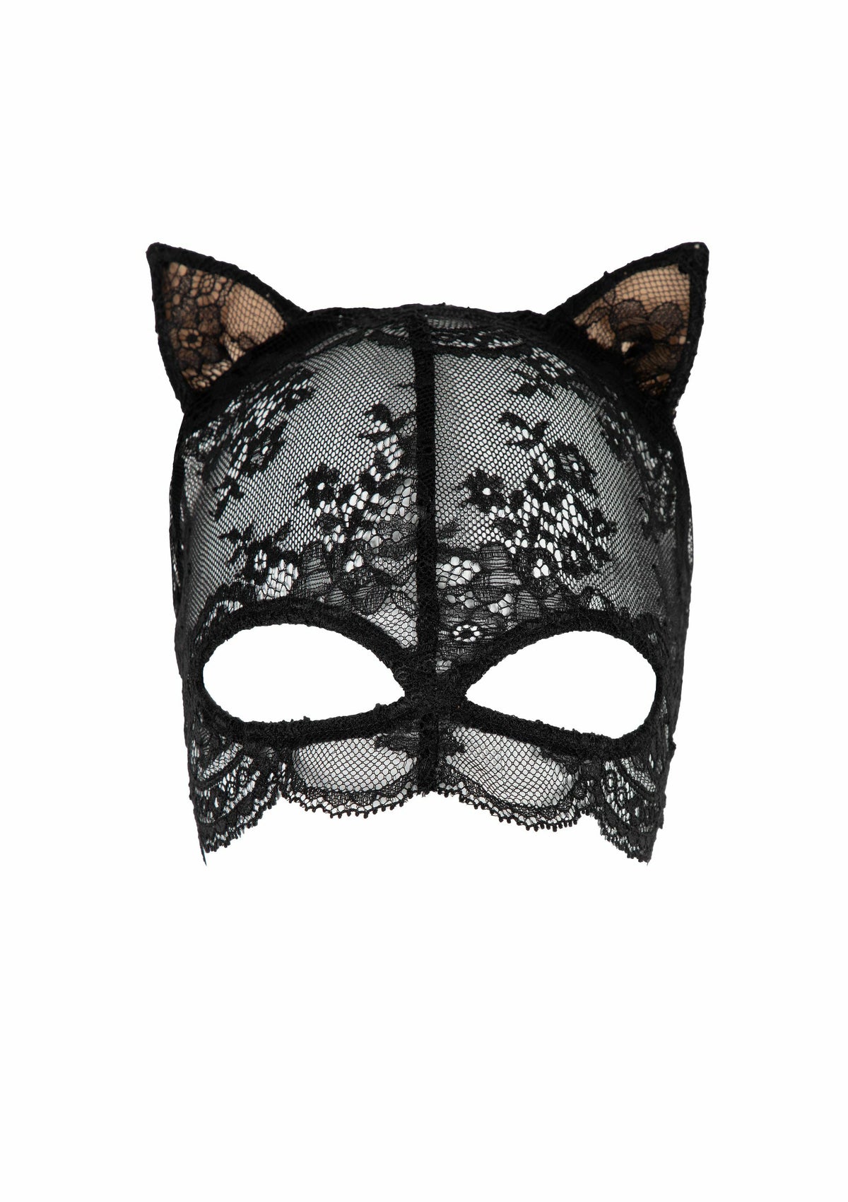 Lace on the front, openings for the eyes and small ears lined with foam, elastics at the back of the mask.