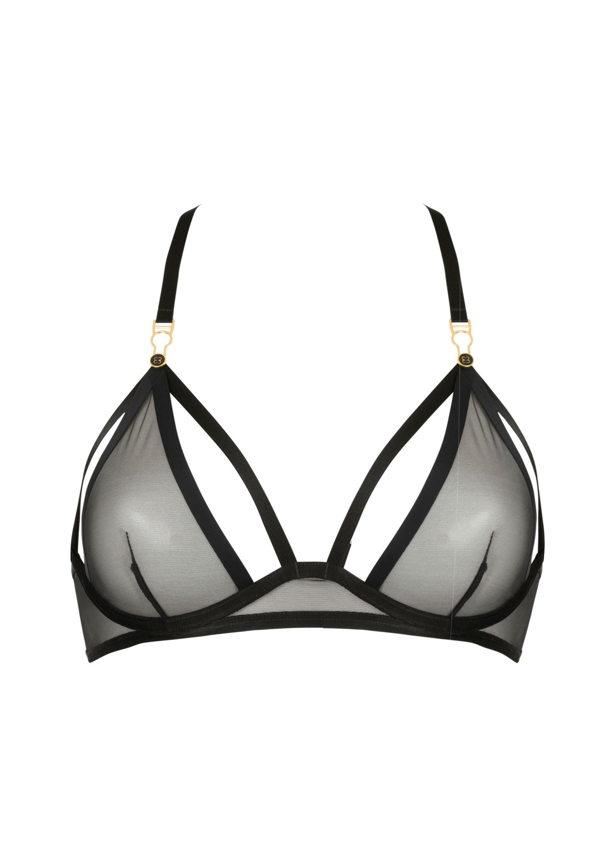 Underwired bra in very soft transparent tulle. The cups open and reveal the chest thanks to jewels and golden buttons.