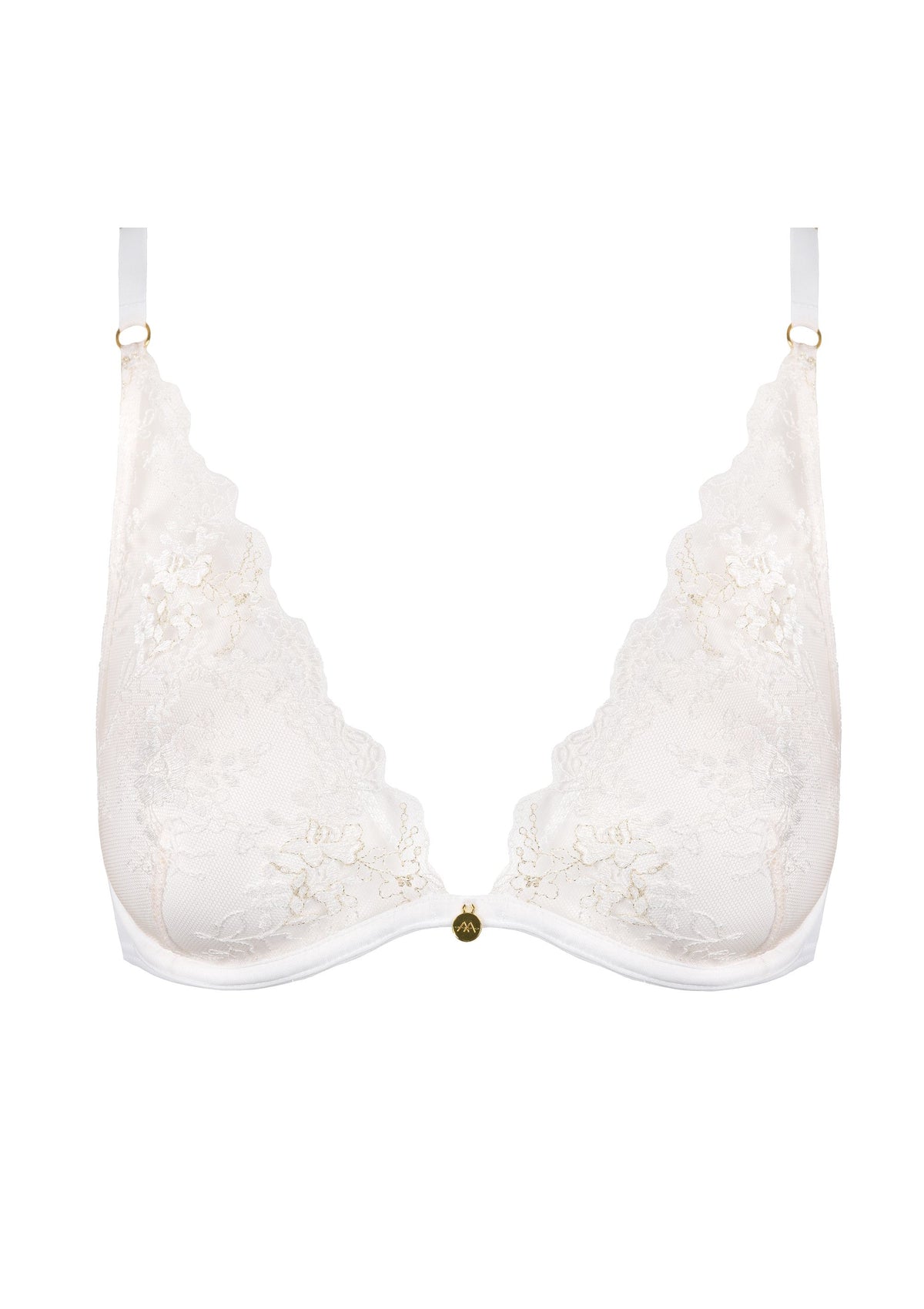 Triangle bra with half-moon underwire and cups entirely in embroidery for a plunging neckline.