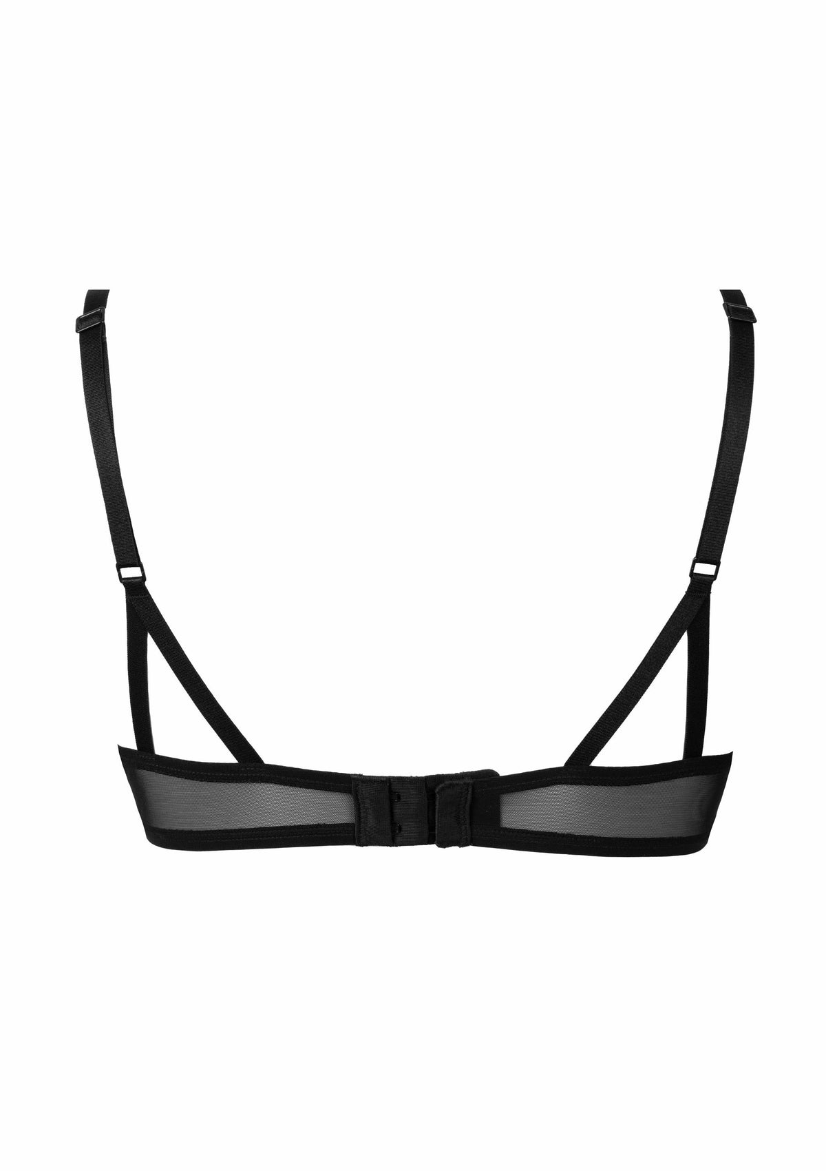 Ce triangle armaturé en tulle transparent joue avec la transparence et les contrastes. Sa broderie végétale encadre la poitrine, tandis que l’armature légère assure un maintien subtil. L'anneau doré apportent une finition précieuse à cette pièce à la fois sensuelle et confortable.